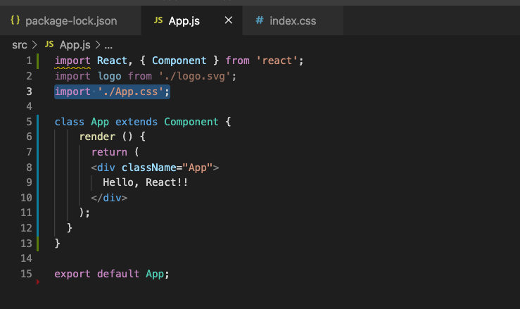 이번엔 App.js로 들어가면 import './App.css’;가 있다