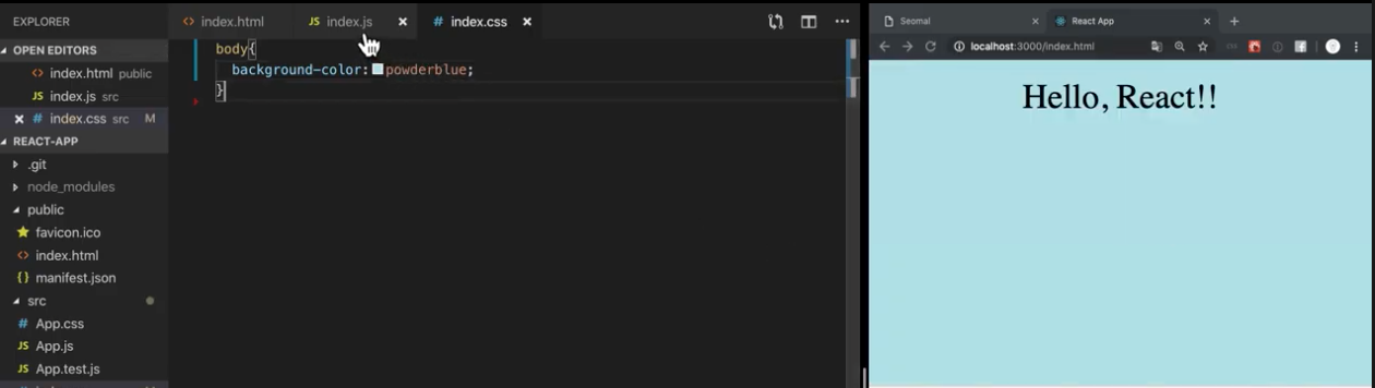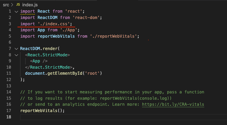 Index.js에 import './index.css’;라는 것이 있다. Index.css로 들어가자