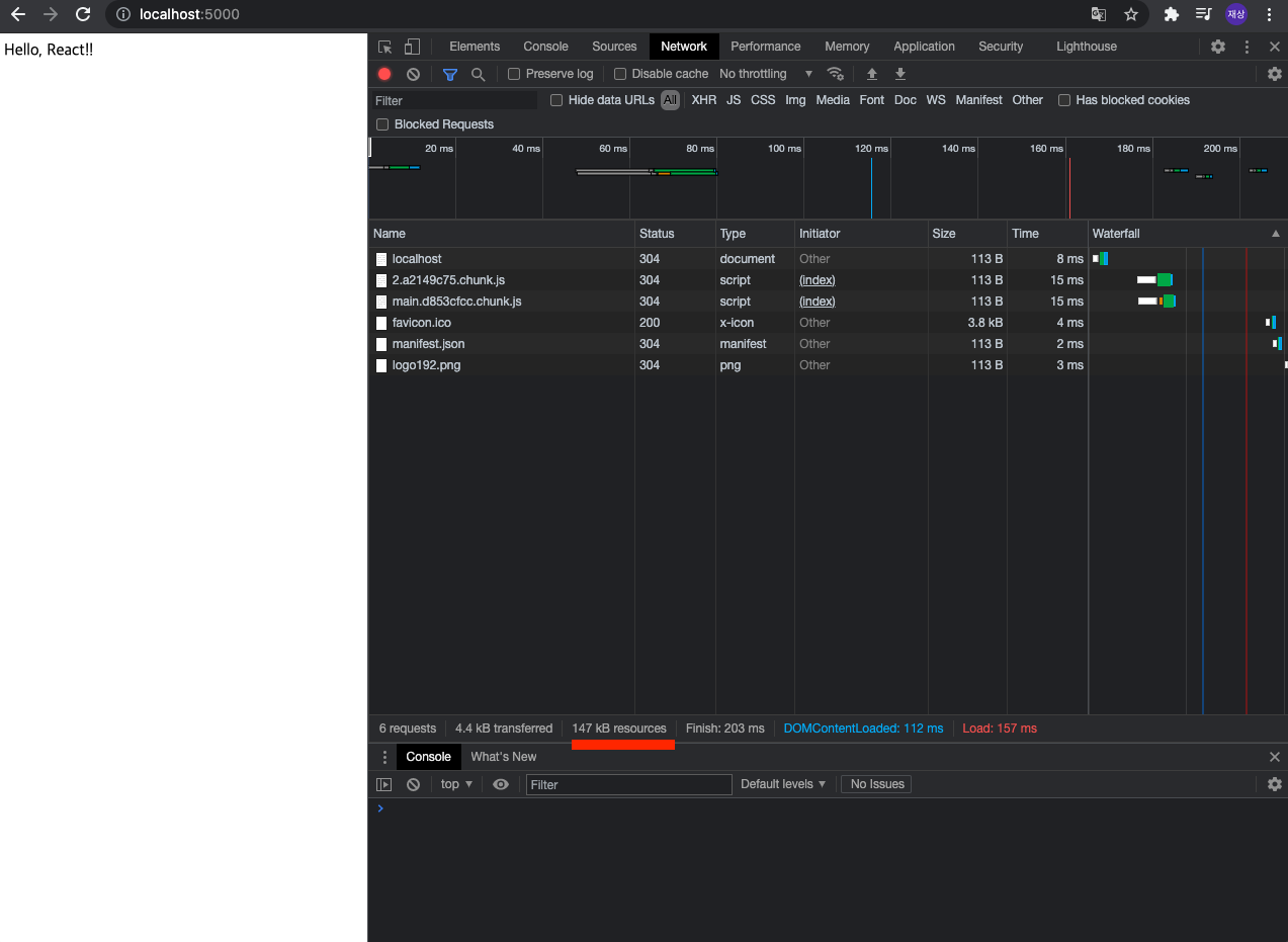 여기서 다시 개발자 도구를 들어가고 Network에 들어가면 리소스가 147kb로 줄어있다.