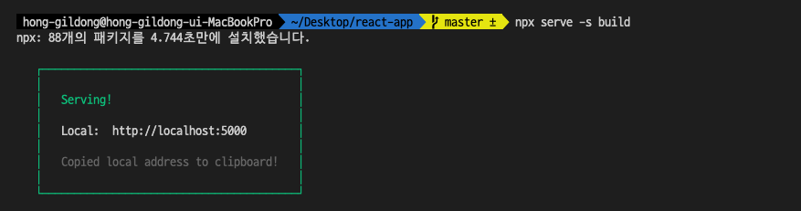 여기에 -s build를 붙이면 serve라는 웹 서버를 다운받아서 실행 시킬 때 빌드(build)라는 디렉토리를 document route로 하겠다