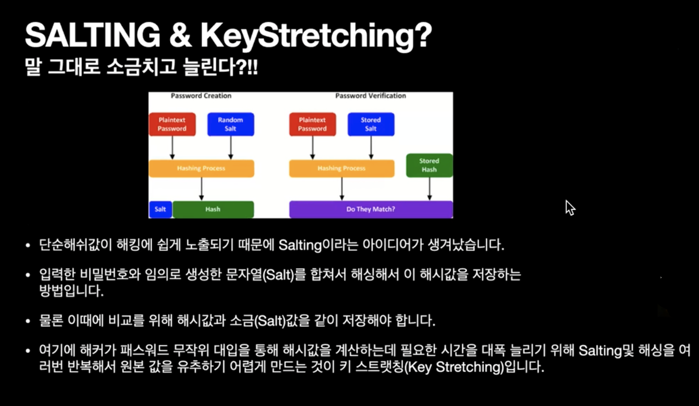 Key Stretching = 솔트값이랑 합쳐서 해싱을 계속 늘려주는 것