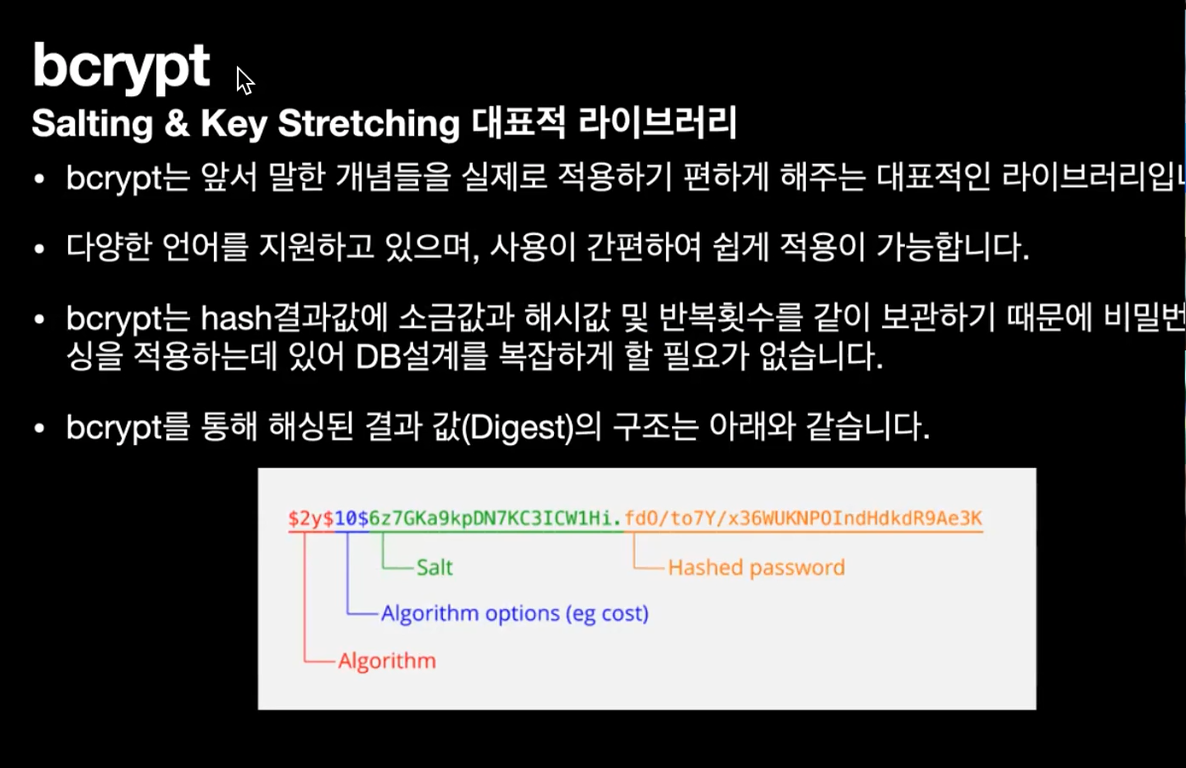 * 솔트값이나 키스트레치를 몇번 했는지 알려준다고? 라고 생각할 수 있지만 해쉬된 비밀번호를 모르면 아예 소용이 없다.