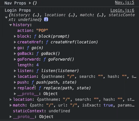반면 login props는 history, location, match 이런 값들이 들어와 있다.