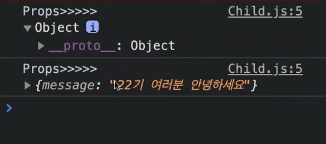 Child.js에서 console.log(this.props)를 해보니 둘 다 잘 넘어왔다