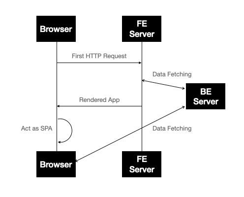 - 미리 실행되고 있는 FE 서버가 요청을 받고 서버사이드 렌더링.